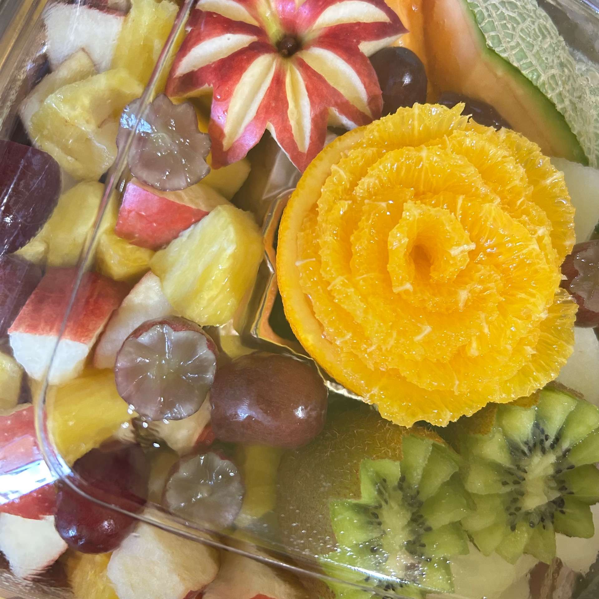 今回はオレンジ🍊で花を作ってくださり、リンゴ、梨、ぶどう、キウイ、パイナップルと盛り沢山のフルーツでした。